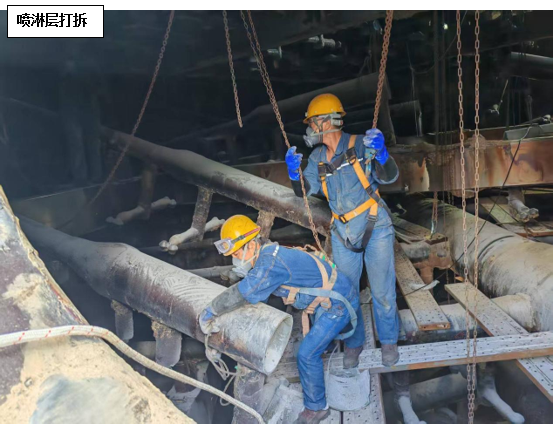 維修方案確定后,攀藍(lán)鼎立即開(kāi)始著手噴淋管道采購(gòu)預(yù)制工作,考慮到目前燒結(jié)產(chǎn)能不飽和,系統(tǒng)多處停機(jī)的因素,決定預(yù)制管道到廠后由檢修進(jìn)行拆除及更換,只保留技術(shù)性要求較高的玻鋼粘接由專(zhuān)業(yè)施工人員來(lái)完成。7月24日,在材料到廠后,檢修立即開(kāi)始在塔內(nèi)布置安全措施,并進(jìn)行噴淋層打拆工作,打拆過(guò)程中檢修對(duì)切下的三通支管進(jìn)行仔細(xì)甄別,磨損嚴(yán)重的進(jìn)行報(bào)廢處理,還具備使用價(jià)值的作為備件歸置,以確保物盡其用。打拆完畢后,檢修隨即進(jìn)行管道吊裝及內(nèi)部組裝配管工作,配管完成后防腐單位開(kāi)始進(jìn)場(chǎng)作業(yè),在此過(guò)程中檢修全程安排人員進(jìn)行組對(duì)及工程質(zhì)量監(jiān)督工作,并及時(shí)撤場(chǎng)收尾。